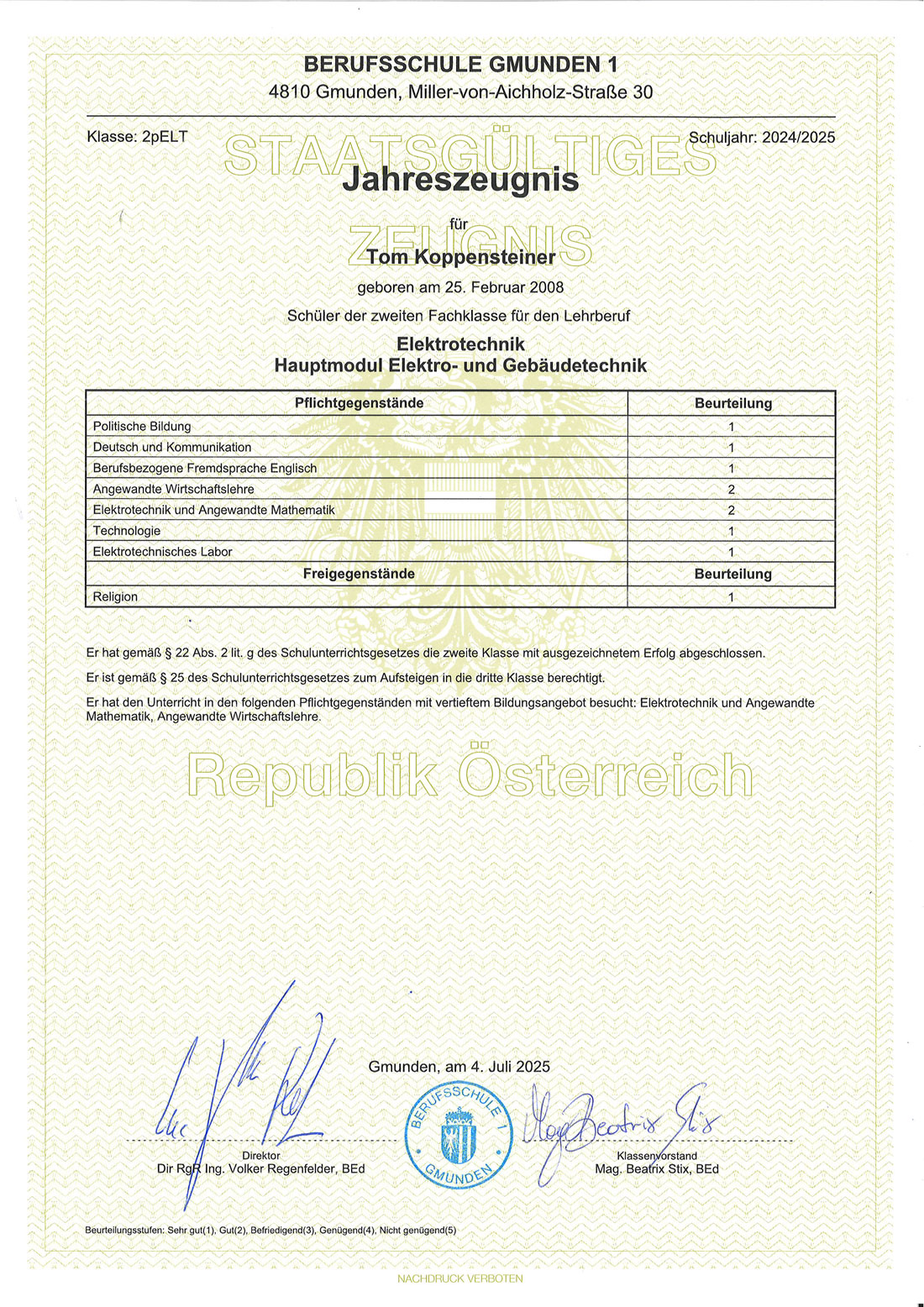 Unser Lehrling Tom Koppensteiner absolvierte die 2. Berufsschulklasse mit einem ausgezeichneten Erfolg. Wir gratulieren ganz herzlich!